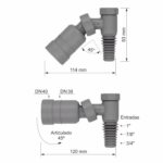 Compatível com diâmetros de entrada de 1.7/8″ e 3/4″ e de saída DN40 e DN38, este adaptador articulado 45º e 90º com retenção é fabricado com plásticos de engenharia e elastômeros, garantindo durabilidade e resistência.