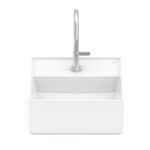 Por ser uma cuba com mesa, ela dispõe de um espaço para a instalação da torneira na própria cuba, ampliando a possibilidade de escolha do usuário, que poderá definir se prefere uma torneira de bica baixa ou alta.