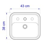 Essa cuba de apoio para banheiro é produzida em louça na cor branca, formato retangular e possui 43 cm de comprimento, 38 cm de largura e 12,5 cm de altura.