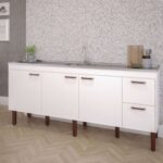 Fabricado em MDF, esse gabinete de cozinha branco possui 194 cm de largura, 51 de profundidade, 87 cm de altura e sua estrutura tem 3 portas e 2 gavetas.