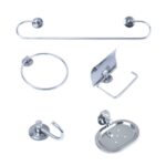 Com um design inovador e moderno, esse kit cromado é composto por 1 porta toalha de banho curvo de 40 cm, 1 porta toalha de rosto argola, 1 porta papel higiênico com tampa, 1 cabide simples, 1 saboneteira e contém 6 buchas s6 e 6 parafusos.