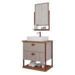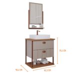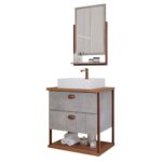 Fabricado em MDF, o gabinete para banheiro com cuba e espelheira da MGM tem 61,3 cm de largura, 45 cm de profundidade e 75,1 cm de altura.