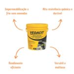 Essa massa asfáltica da Vedacit é comercializada pronta para o uso, possui uma aplicação a frio, não gera emendas e pode ser moldada no local.