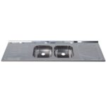 Essa pia possui 1,80 m de comprimento, 52 cm de largura e dispõe de duas cubas embutidas de acabamento polido com 46x30x11cm cada.
