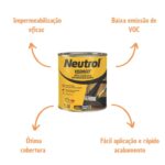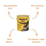 A pintura asfáltica Neutrol rende até 7,2m2 e seu tempo de secagem é de 5 dias para que possa haver contato na superfície aplicada.