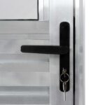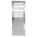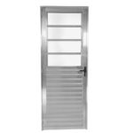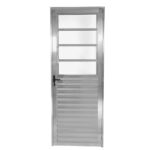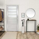Simultaneamente, a porta de alumínio brilhante possui vidro do modelo mini boreal, que proporciona privacidade para os moradores graças à sua textura.