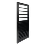 Essa porta basculante na cor preta também tem pintura eletrostática, que tem alto nível de acabamento final, não agride tanto o meio ambiente e é indicada para ambientes externos por proteger contra ferrugem, umidade e pragas.
