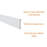 Assim sendo, esse rodapé branco poliestireno possui acabamento liso e branco, que harmoniza facilmente com diferentes estilos de decoração, do clássico ao moderno. Além disso, pode ser pintado, caso seja necessário personalizar a cor.